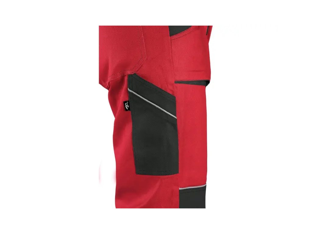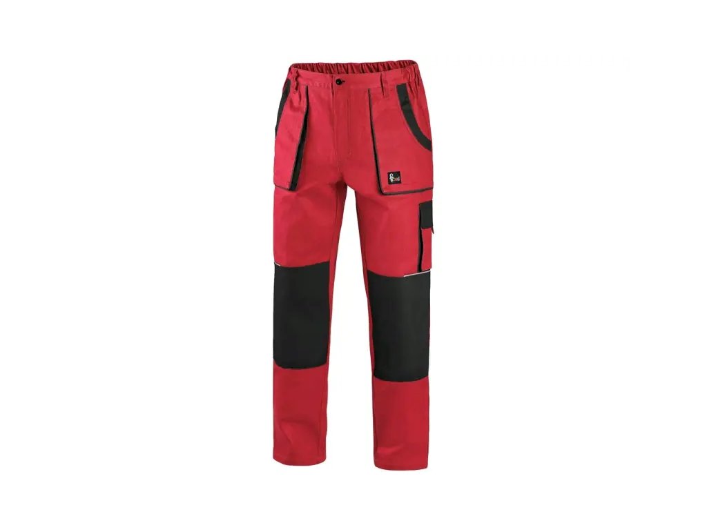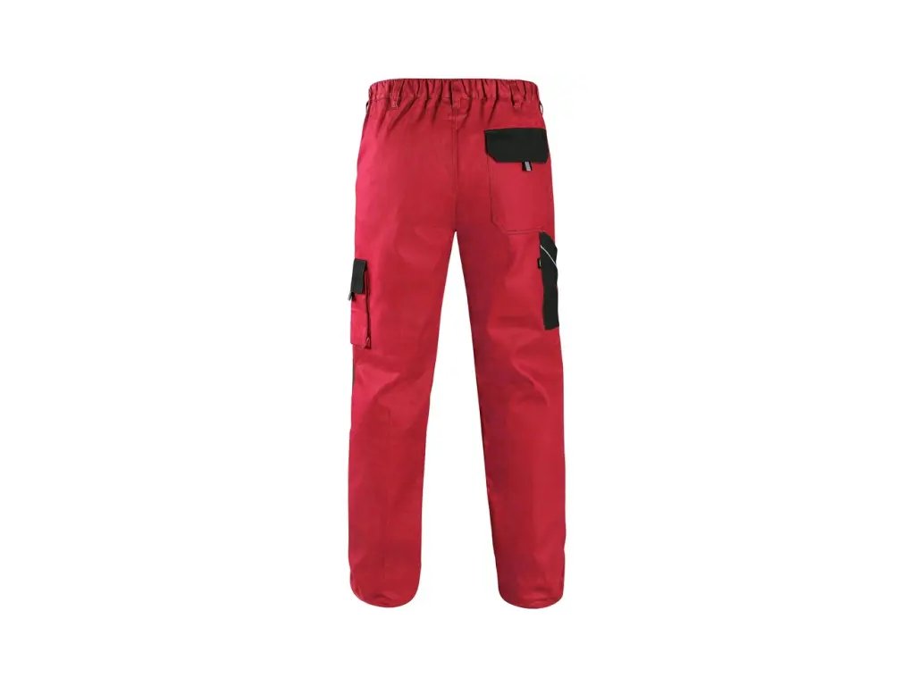 Pánské montérkové kalhoty, pas s poutky na opasek, vzadu do gumy, přední kapsy, boční kapsa na svinovací / skládací metr, boční kapsa na mobil / peněženku, zdvojená kolena, zadní kapsa s klopou, reflexní doplňky.