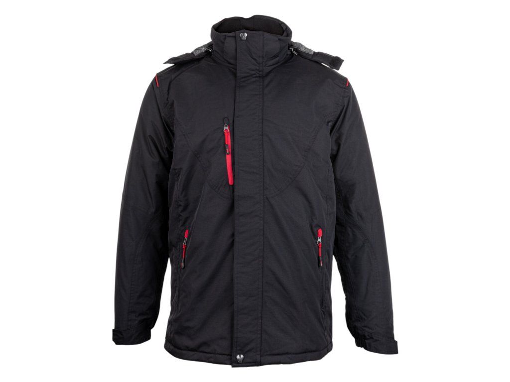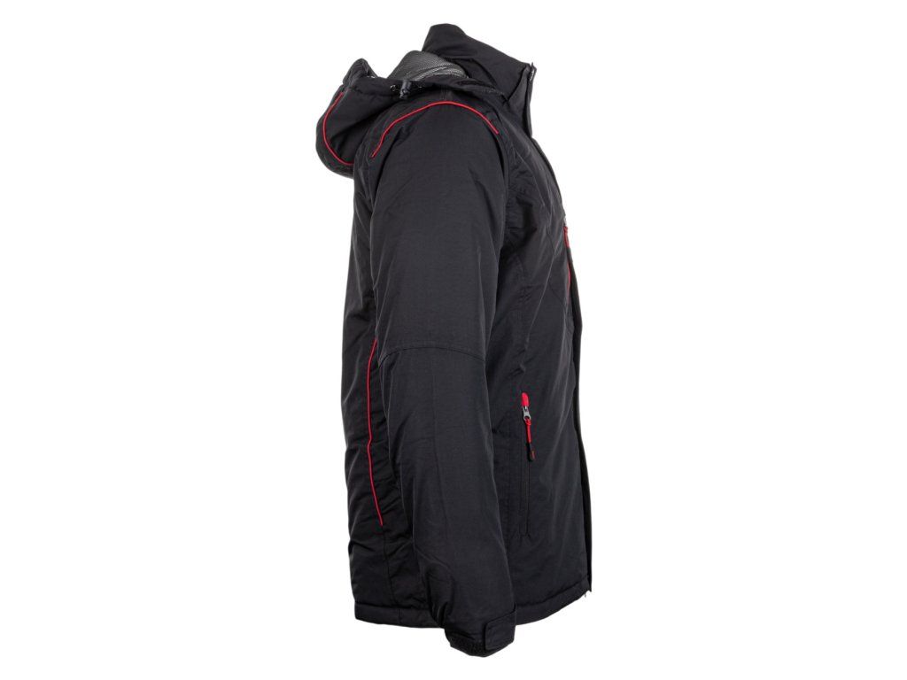 Voděodolná zimní bunda kvalitní dvojité šití pro větší odolnost prodloužená zádová délka odolnost materiálu proti průniku vody 8000 mm mimo oblast švu reflexní prvky pro lepší viditelnost dvoucestný zip s krycí lištou s druky 2 vnější kapsy na zip náprsní kapsa na zip vnitřní kapsa na telefon s vývodem na sluchátka odepínací kapuce elastické vnitřní manžety s otvory pro palce nastavitelná šířka manžet rukávů pomocí suchého zipu regulace obvodu boků odepínací sněžný pás Barva: černá s červenými detaily