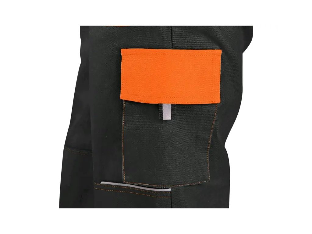 Pánské montérkové kalhoty s náprsenkou, náprsní kapsa na zip, pas vzadu do gumy, přední kapsy, boční kapsa na svinovací / skládací metr, boční kapsa na mobil / peněženku, zdvojená kolena, zadní kapsa s klopou, šle s gumou vzadu, reflexní doplňky. Doporučené použití: stavebnictví, lehký průmysl, logistika, skladová manipulace, autoservisy, údržba, montáže, zemědělství, zahrada, hobby.