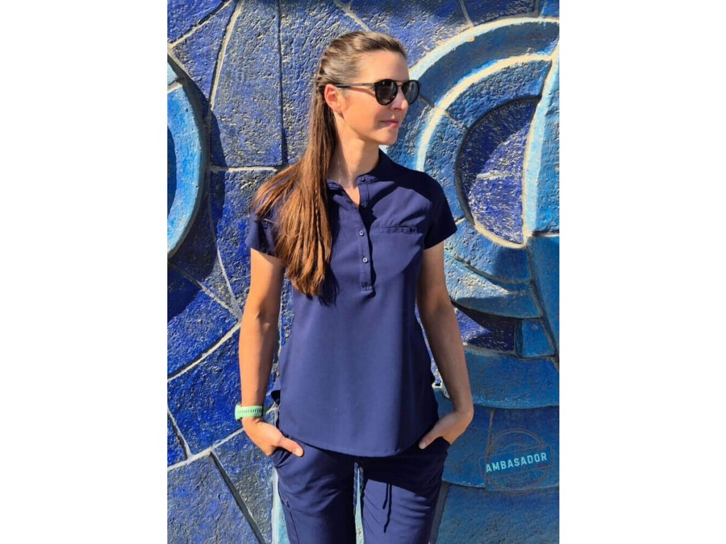 Košile velikosti XS není upnuta, je volnějšího charakteru, což je pro zdravotnický sektor vhodnější. Střih u dekoltu je řešen elegantně pomocí 5 knoflíků až ke krku. Košili lze nosit jak lehce přes kalhoty, ale také košili vsunout pod kalhoty vyššího střihu a vypadá to moc pěkně. U košile jsem byla ráda za kapsu, kde můžu nechat světlo od lupových brýlí, nebo propisku na psaní.