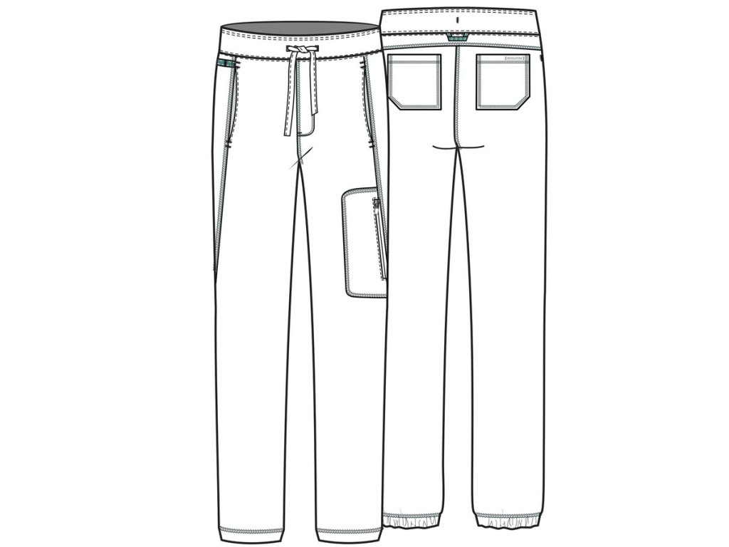 Praktické detailyPri práci oceníte 5 praktických vreciek, ktoré vám zaistia voľné ruky, zatiaľ čo sa staráte o svojich pacientov. Na pravej strane nájdete reflexné pútka na nástroje. V zadnej časti nájdete pútko a reflexnú pásku s nápisom kolekcie Revolution na zadnom vrecku. Spodná časť nohavíc je v zadnej časti riešená riasenou gumou.